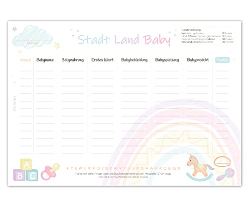 WITZIG UND UNTERHALTSAM: Die Stadt Land Fluss Baby-Variante sorgt für viel Spaß und gute Laune unter den Mädels und bringt viele Lacher mit sich. Eine tolle Überraschung für jede Babyparty. LIEBEVOLLES DESIGN: Das süße Design ist mit seinen niedlichen Illustrationen sowohl für Mädchen als auch Jungs optimal. Daher ist der Spielblock auch perfekt für eine Gender Reveal Party geeignet. IDEALES GESCHENK: Das Partyspiel eignet sich super als Geschenk für die werdenden Eltern, auch schon während der Schwangerschaft. Und danach ist es eine tolle Erinnerung, die man sich gerne mal wieder anschaut. HOCHWERTIG: Top Druckqualität auf hochwertigem und nachhaltigem 80g/m² Papier mit PEFC-Siegel, in Deutschland entwickelt und gedruckt Weitere PICTALOO Papeterie Artikel findest du in unserem Shop. Unter anderem auch passende Babyorakel Ratekarten für noch mehr Spaß auf der Babyparty., Hersteller: PICTALOO