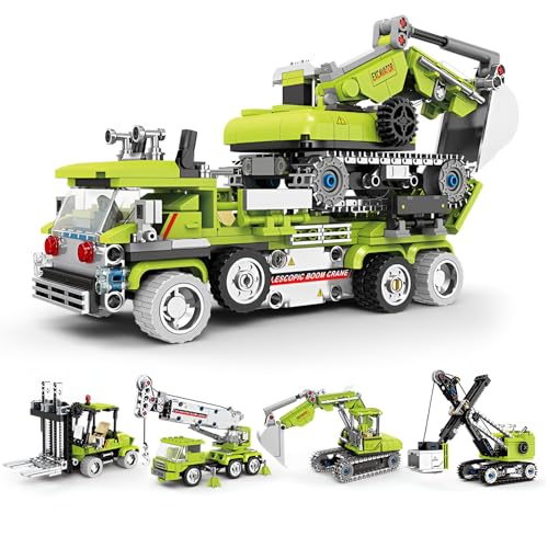 4 IN 1 Stadt Konstruktion LKW Bausteine Bausatz, Engineering Fahrzeuge Modell Klemmbausteine mit Muldenkipper, Bagger, Kran, STEM Lernspielzeug, Geschenkideen für Kinder im Alter von 6+ (912 Stücke)
