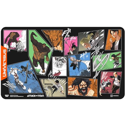 Tisch-Gaming-Zubehör: Erhöhen Sie Ihr Spielerlebnis. Verwenden Sie es mit Ihrem nächsten Universus Match-Up! HOCHWERTIG: Hochwertige Neopren-Spielmatte. Maße: 61 x 35,6 cm. Bleibt an Ort und Stelle: glatte Oberfläche mit Gummi-Rückseite, um ein Verrutschen der Matte zu verhindern. Exklusive Designs mit Ihren Lieblings-Attack on Titan-Figuren und Szenen aus dem UniVersus Kartenspiel 【Achtsame Verpackung】Jede Spielmatte ist in einer stabilen Box verpackt, die zum Aufhängen oder für Regaldisplays geeignet ist., Hersteller: UVS Games
