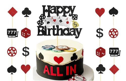 17 Stück Poker Casino Happy Birthday Cake Toppers, Casino Poker Dice Cake Decoration Kit, Schwarz Rot Glitter Casino Chips Herz Cupcake Toppers für Las Vegas Themed Birthday Party Decor