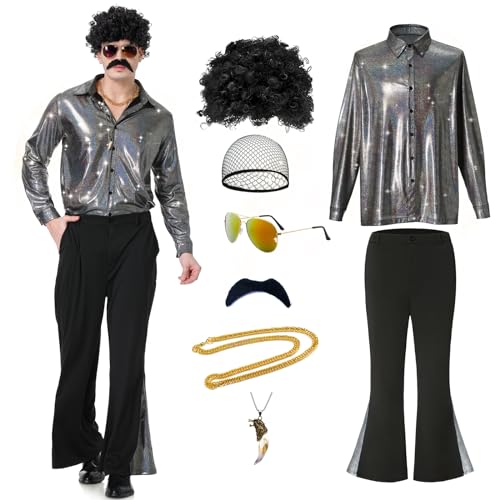 Coseaon Herren 70er Jahre Disco Kostüm Outfit mit Perücke Sonnenbrille Schal Halskette Halloween Karneval Sänger Jumpsuit für Erwachsene (Weiß, 2XL)