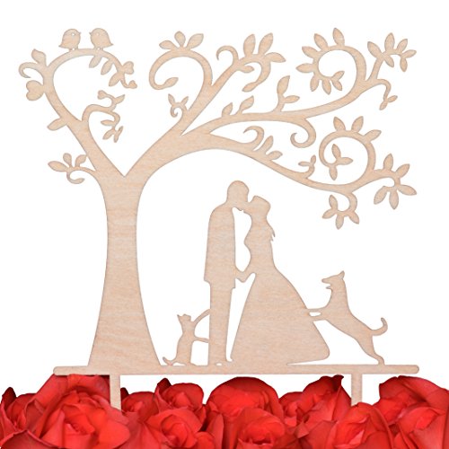 LOVENJOY Tortendeko Hochzeit Cake Topper Holz Küssen Brautpaar mit Hund und Katze für Hochzeitstorte Deko, Geschenkbox
