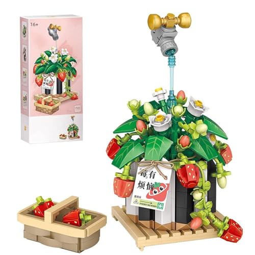 Pasyru Bonsai Pflanzen Bausatz, 686 Teile Erdbeer und Amaryllis Strauß im Topf, Mini Baustein, kreativer DIY Kunstblumen Bausatz, Geschenk für Jugendliche und Erwachsene