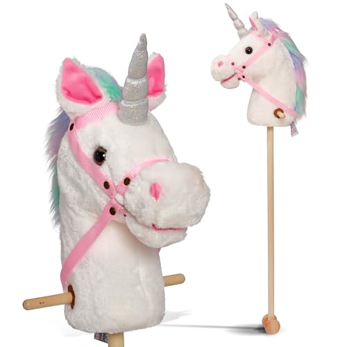 Pink Papaya Steckenpferd Einhorn, Mandy süßes Spielzeug Einhorn aus Plüsch mit Sound Funktion: Gewieher und Galoppgeräusch - Farbe: weiß mit rosa Mähne