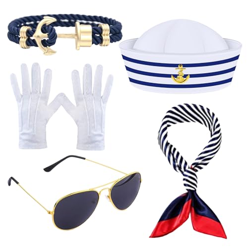 【Tolles Set】Sie erhalten ein Set von Matrosenbekleidungszubehör, einschließlich Matrosenmütze, Matrosen-Seidentuch, weiße Handschuhe, Ankerarmband und modische Sonnenbrille, die Ihnen helfen, mit raffinierten Accessoires einen modischeren Seemanns-Look zu kreieren. 【Hochwertiges Material】Matrosenmütze und Handschuhe sind aus hochwertigem Polyester-Baumwollgewebe, leicht und atmungsaktiv. Der Satin-Seidenschal ist glatt und weich und fühlt sich angenehm an. Sonnenbrillen bestehen aus Metallrändern und Kunststoffgläsern für Langlebigkeit. Anker Armband ist einfach zu tragen und stilvoll. 【Einzigartiges Match】 Die Matrosenmütze mit blau-weiß gestreiftem Design und cooler Sonnenbrille kann zusammen mit dem Matrosenschal, den weißen Handschuhen und dem Anker-Armband Ihrem Outfit einen nautischen Geschmack verleihen und Ihren schneidigen Seemannsgeist zeigen. Vielseitig einsetzbar: Sie können dieses Set von Matrosen-Accessoires in Ihrem täglichen Leben tragen, um einen glamourösen nautischen Look für Sie zu kreieren. Oder als aufmerksames Geschenk für nautische Enthusiasten und Freunde, um gemeinsam die Segelreise zu erleben. 【Eventzubehör】Das Matrosenmützen-Set ist das perfekte Matrosen-Kostüm für nautische Themenveranstaltungen, Strandhochzeiten, Junggesellenabschiede, Halloween, Kostümpartys, Bühnenshows, Cosplay, Karneval und mehr., Hersteller: GIEEU