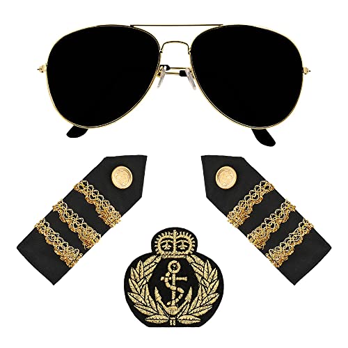 Das Kostüm Set Kapitän ist ein Muss für den Junggesellenabschied oder die Faschingsparty Enthalten sind die Brille, eine Anstecknadel und ein Paar Schulterpolster Die Accessoires sind in den Farben Dunkelblau und Gold gehalten, Hersteller: Boland