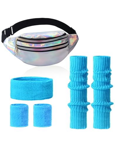 Clundoo 80er Jahre Outfit Damen Set - Bauchtasche Neon, Stirnband, Beinwärmer, Handschuhe für 90er Kostüm Party Fasching Karneval (Blau)