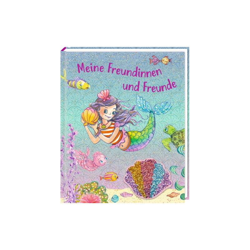 In dieses fröhlich-bunte Buch können sich kleine Meerjungfrauen und ihre Freundinnen und Freunde eintragen. Die 96 liebevoll gestalteten Seiten bieten viel Platz zum Malen, Ankreuzen und Einkleben – für jedes Kind gibt es vier Seiten. Zusätzlich enthält das Freundebuch Eintragseiten für drei Erzieher und alle wichtigen Geburtstage. Format: 16 x 19,5 cm Seiten: 96 Ausstattung: - Hardcover - Einband mit Holografiefolie - Wendepailletten-Patch in Muschelform