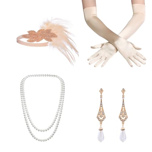 DAZZLUXE 1 Champagnerfarbener Anzug, Stirnband, Ohrringe, Halskette, Handschuhe, Damenaccessoires Der 1920er Jahre, Der Große Gatsby, Damenbekleidung Der 1920er Jahre