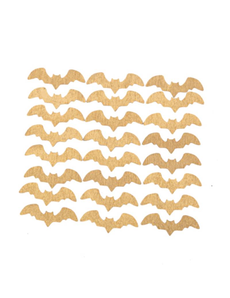 Dieses Set besteht aus 24 Konfetti-Fledermäusen in einer Größe von ca. 4 cm. Sie bestehen aus goldfarbenem Holz. Die putzigen Deko-Fledermäuse eignen sich ideal als Konfetti für Ihre Tischdekoration zu einer hübschen Halloween-Party mit Freunden.