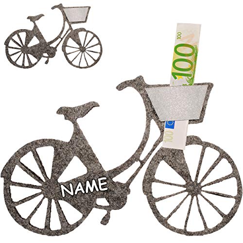 DER Hingucker für viele Gelegenheiten: _____ sehr schönes großes ___ " Filz Fahrrad " __ Farbe: grau viele Einsatzmöglichkeiten: eine tolle Verpackung für Geldgeschenke und Gutscheine, als besondere Glückwünschkarte ____ aber auch Foto´s und Bilder können wunderschön verpackt und dekoriert werden ___ auch als Deko und zum Basteln das Fahrrad hat einen tollen 3D Effekt ___ / das Mittelteil ist offen, dorthin kann man Geld oder Karten einstecken __ Material: stabiler und sehr hochwertiger Filz __ Größe: circa 15,5 cm breit; 11 cm hoch und 0,6 cm dick ___ ( die Lieferung erfolgt OHNE Geldschein ! ) das Fahrrad paßt in jeden Briefumschlag ___ ideal für eine Reise & Urlaub, Hochzeit & Flitterwochen, neues Fahrrad, E-Bike Kauf u.v.m. inclusive: Individuell mit Ihrem WUNSCHvorNAMEN zum Aufbügeln - der Name wird passend angefertigt ___ die Nachfrage des Namen`s erfolgt - AUTOMATISCH innerhalb 4 Stunden - bitte vorher KEINE Nachricht senden ___, Hersteller: alles-meine.de GmbH Glückwünsche Geldgeschenkver..