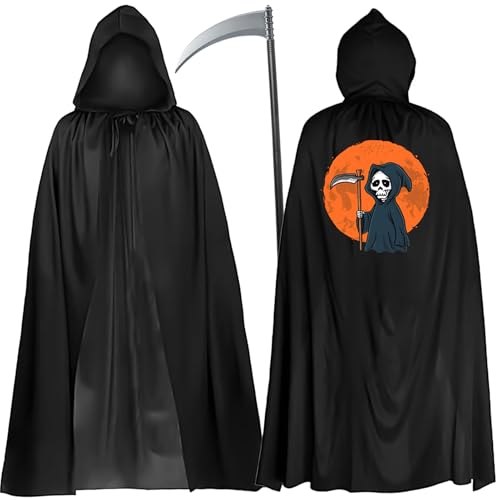 Giggleye Schwarzer Umhang mit Sensenmann-Motiv und Todessense, Herren Damen Kapuzenumhang, Sensenmann umhang für Karneval Halloween Weihnachten Kostümparty (140 cm Umhang, 105 cm Sense)