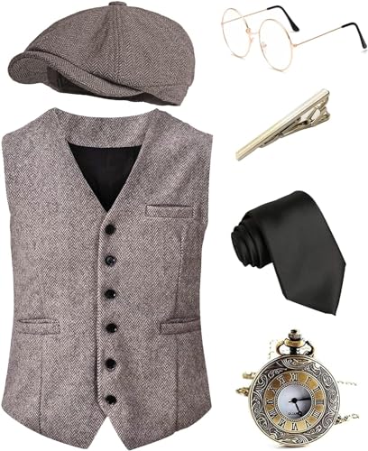 Halloween 1920er Jahre Herren Great Gatsby Kostüm Paket beinhaltet: 1 x Herren Classic Fischgräten-Tweedweste; 1 x Vintage Gatsby Lvy Cabbie Hut; 1 x Opa/Old Man Brille; 1 x Roaring 20er Jahre Taschenuhr; 1 x schwarze Krawatte; 1 x Krawattenklammer; Klassische Vintage-Newsboy-Gatsby-Hutkappe für Herren ist ein Must-Have der 20er-Jahre-Accessoires, perfekt für Fotoshootings oder sogar 1920er-Jahre-Kollektion Fischgräten-Tweed-Anzugweste, Weste, vervollständigen Sie Ihren 1920er-Jahre-Look mit diesem Vintage-Gangster-Westen-Outfit-Set. Taschenuhr mit Kette ist eine tolle Ergänzung für eine 1920er-Jahre-Mottoparty. Perfektes Halloween-Kostüm-Set für Herren für 1920er-Jahre-Party, Vintage-Party, Abschlussball, Hochzeit, Great Gatsby-Party, Art-Deco-Flapper-Party und alle anderen Vintage-Anlässe., Hersteller: EFORLED