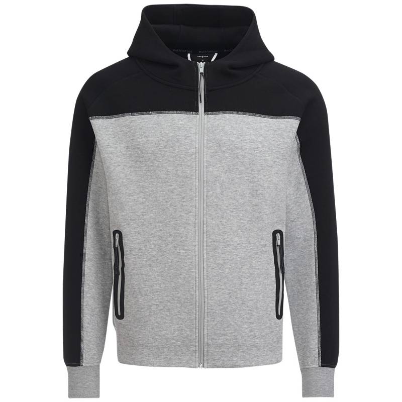 Bequemes beim Sport! Sweatjacke in Hellgrau meliert und Schwarz mit hoch geschlossener Kapuze, Reißverschluss und formstabilen Rippbündchen. Vorne mit zwei Reißverschlusstaschen. Kleiner reflektierender Print hinten auf der Schulter.