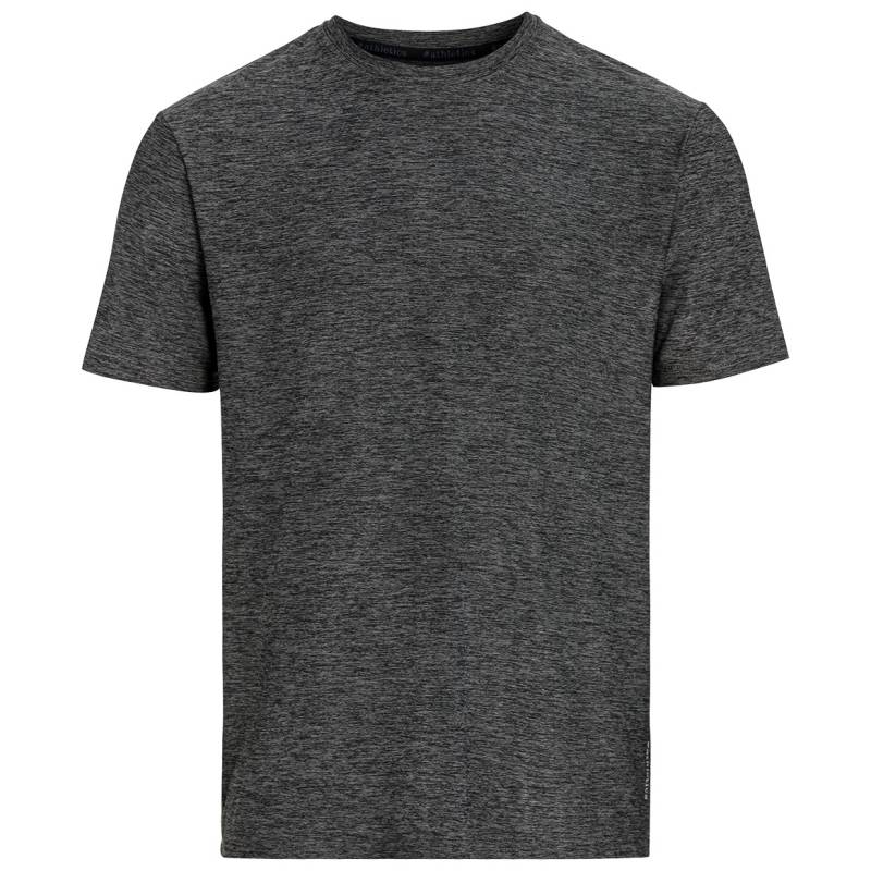 Sportlich unterwegs! Dunkelgrau meliertes T-Shirt aus leichtem Material mit kleinem, reflektierendem Schriftzug links am Saum. Mit feinem Bündchen am Rundhalsausschnitt.