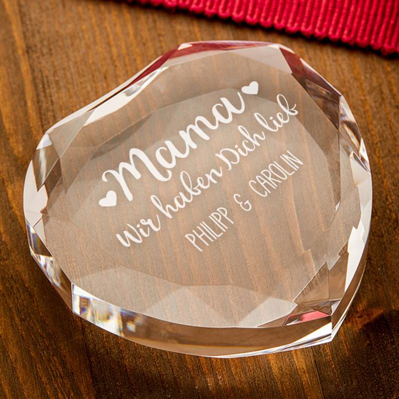 Herz aus Glas als Zeichen Deiner Liebe für Mama Was wünscht sich eine Mutter zum Geburtstag? Als Sohn oder Tochter wirst Du bestimmt sagen, dass sich Deine Mama vor allem wünscht, dass es ihren Kindern gut geht und, dass diese mit den Entscheidungen, die sie im Leben treffen, glücklich und zufrieden sind. Bist Du auf der Suche nach einem Geschenk für Mama mit einer persönlichen Note, das dekorativ und zugleich liebevoll ist, dann ist ein Herz-Diamant mit Gravur - Mama das genau Richtige. Mamas sind kreativ und wissen doch eigentlich für alles eine Lösung. Bestimmt weiß auch Deine Mama bereits jetzt den passenden Platz für ihr neues liebevolles Geschenk. Das Glasherz für Deine Mama ist besonders schwer und hochwertig gefertigt. Mit seinem Gewicht von über 300 Gramm kann es besonders gut als eleganter Briefbeschwerer benutzt werden. Doch auch in der Geschenkschatulle, in der das Herz geliefert wird, gibt es eine gute Figur ab. Das Futter der Box umfasst das Herz aus Glas und gibt