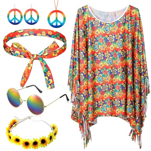 LETTERASHQP 6 Sück Hippie Kostüm Damen 70er jahre Outfit Damen Hippie Accessoires Hippie Kleidung Damen Hippie Halskette Ohrringe Haarband Sonnenbrille Kostüm Hippie Frau Karneval Kostüm Damen