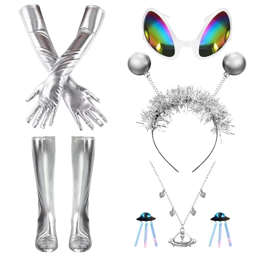 LETTERASHQP Alien Haarreif silber Haarreif Alien Silber Alien Kostüm Set Kopfschmuck Accessoire & Deko Alien Ohrringe Haarschmuck für Damen Herren & Kinder