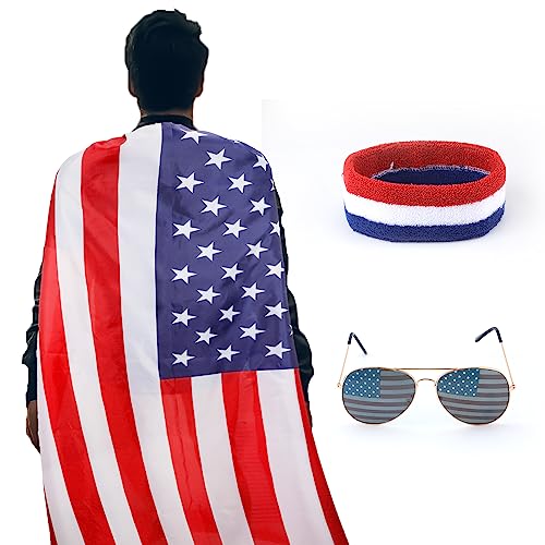 LUTER 3-teiliges Zubehör für den 4. Juli, amerikanische Flagge, Kostüm-Umhang, Retro-Sonnenbrille der 80er Jahre, amerikanische USA-Sonnenbrille und rot-weißes und blaues Bandana-Stirnband, Outfits