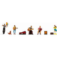 Inhalt: 6x Figuren darunter: - Gitarrenspieler - Gitarrenspielerin mit Hund - Geigenspielerin - Akkordeon-Spieler - Einradfahrer mit Lufballons Straßenkünstler In beliebten Einkaufsstraßen sind auch immer die unterschiedlichsten Straßenkünstler vertreten. Am meisten sieht man hier Musiker mit Gitarre und Akkordeon. Aber auch Streichinstrumente, Einradfahrer und Luftballonkünstler sind vertreten. Mit unserem Figurenset beleben Sie die Einkaufstraße in Ihrer Modellbahnanlage und machen diese zum ganz besonderen Einkaufserlebnis! Das Figurenset enthält 6 Figuren: Einen stehende Gitarrenspieler, der eine Sonnenbrille aufgesetzt hat und Jeans und ein braunes Oberteil trägt. Sowie einen sitzenden Gitarrenspieler, der eine dunkelbraune Hose und ein lockeres blaues T-Shirt sowie einen Hut trägt. Außerdem hat er einen Gitarrenkoffer für Kleingeld vor sich auf den Boden gelegt. Auch ein Akkordeonspieler ist beim Set enthalten. Dieser sitzt auf einem Hocker und hat ein rotes Akkordeon auf dem Schoß. Er trägt ein rosa Hemd und kurze Jeanshosen. Auch er hat seinen Instrumentenkoffer vor sich auf dem Boden aufgestellt. Eine weitere Figur spielt Geige Sie hat eine gelbe Jacke und einen kurzen blauen Rock sowie passende gelbe Schuhe an. Ein Einradfahrer mit Luftballons macht die Szene komplett. Er hat eine schwarze Hose mit Hosenträgern an, dazu weiße Handschuhe und die Luftballons in einer Hand.