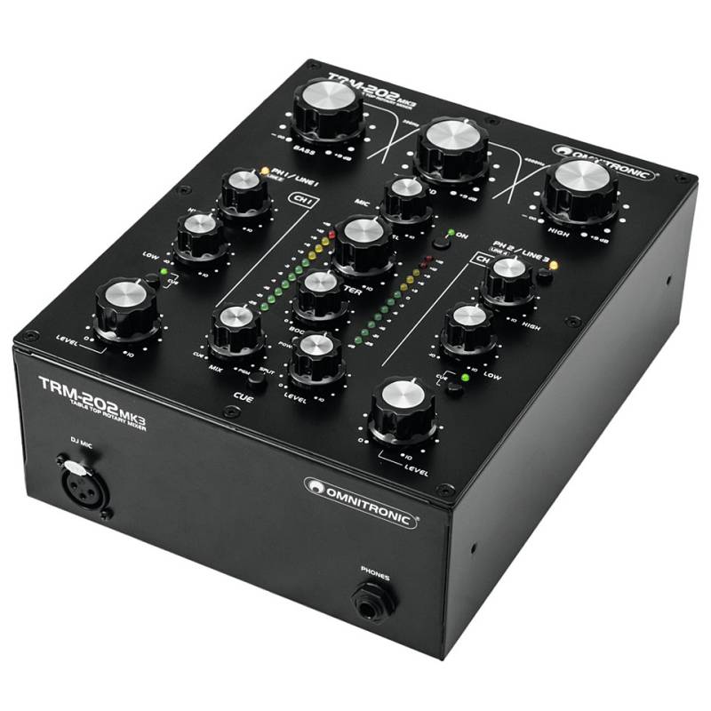Der TRM-202 MK3 von Omnitronic bietet dem DJ mit seinen klassischen ALPS-Drehreglern (Blue Velvet RK27) und dem eingebauten 3-Band-Frequenzisolator die klassischen Features eines Rotary-Mixers. Durch die hochwertigen Bauteile ist ein gutes und ansprechendes Klangbild gegeben. Die großen Drehregler beider Kanäle erlauben sehr sanfte Übergänge, welche mit einem herkömmlichen Mixer (mit Fadern) so nur schwer zu setzen sind. Bei beiden Kanälen kann zwischen 2 x Line- & Phono-Eingängen oder Quellen umgeschaltet werden. Auch ein Mikrofon-Eingang ist vorhanden. Die Kill-Charakteristik des Isolators sorgt für die völlige Auslöschung von Bässen, Mitten und Höhen und somit für kreatives Mixen. · Battlemixer · Bauform: Tabletop · Gehäusefarbe: Schwarz · Gehäusematerial: Metall · Rackeinbau: nein · Abmessungen: 190 x 107 x 250 mm · Gewicht: 2,75 kg · Kanalanzahl: 2-Kanal Mixer · Mic-In: 1 · Fader: keine · Effekte: Kill-Charakteristik erlaubt das völlige Auslöschen von Bässen, Mitten und Höhen für · DJ-Mixer