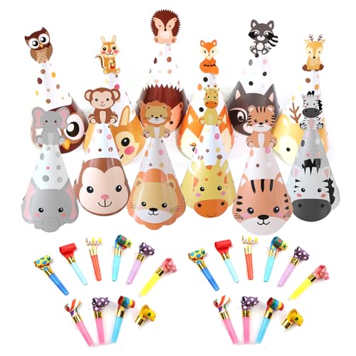 Osuter Partyhüte Kindergeburtstag 12 Party Kegel Hüte Partyhut Geburtstag Partyhütchen mit 20 Lufttröte für Kinder Festival Dekoration