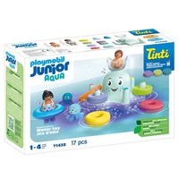 Auf die Plätze – fertig – los! Wer ist zuerst in der Badewanne? Mit den tollen neuen Badesets in Zusammenarbeit mit Tinti macht das Baden gleich noch mehr Spaß! Drei verschiedenfarbige Badetabletten von Tinti färben das Wasser und lassen es wundervoll duften. Was ist die Lieblingsfarbe deines Kindes für das Badewasser? Jetzt wird es bunt! Mit dem lustigen Tintenfisch ist Badevergnügen vorprogrammiert. Seine Arme sind bunt bedruckt und die sechs Ringe lassen sich farblich passend aufstecken. Die kleinen Baby-Kraken schwimmen vergnügt im Wasser und auch die Figuren sind schnell in ihre Schwimmreifen gehüpft. Wer wohl schneller schwimmen kann? Welche Badefarbe soll es sein? Die Tinti-Badetablette lässt sich sicher an der Unterseite des Tintenfisches in einer speziellen Kammer verstauen und färbt das Wasser sprudelnd duftend ein. Neugierige Entdecker:innen können das farbige Wasser mit dem transparenten Steckbecher gleich noch näher untersuchen. Besondere Produktmerkmale: - Tintenfisch mit Farbpunkten auf den Armen zum Farbsortieren - Vier Farbringe und zwei farbige Schwimmringe zum Aufstecken auf die Tintenfischarme - Baderinge können mit Figur bespielt werden - Aufsteckbarer transparenter Becher zur Veranschaulichung des eingefärbten Wassers - Drei Tinti Badetabletten in grün, türkis und lila mit Erdbeerduft - Abnehmbare Sicherheitskammer für die Badetablette mit Dreh/Drück-Mechanismus - Badetabletten in separatem Nachfüllpack erhältlich - Eingedrungenes Wasser in den Baby Kraken lässt sich über die Entwässerungslöcher entfernen - Maße: 14,5 x 13 x 14,3 cm (LxTxH) PLAYMOBIL JUNIOR – gemacht für unsere kleinsten PLAYMOBIL Fans! Perfekt für kleine Hände und erste Kleinkind-gerechte Entdeckungen. Mit vielen attraktiven Funktionen wie Stapel-, Puzzle- oder Sortierspaß. Lass dein Kind im Alter von 1-4 Jahren mit PLAYMOBIL JUNIOR seine ersten Schritte in die große PLAYMOBIL Welt gehen! PLAYMOBIL JUNIOR steht für größtmögliche Sicherheit für dein Kind: PLAYMOBIL JUNIOR wird in der EU hergestellt, und ist frei von Weichmachern und verschluckbaren Kleinteilen. Alle PLAYMOBIL JUNIOR Spielsets sind außerdem zu über 90% aus pflanzenbasierten Kunststoffen produziert, die sich nach dem in der Kreislaufwirtschaft verwendeten Massenbilanzansatz und in Anlehnung an den ISCC-208-Standard rechnerisch zu Materialien zurückverfolgen lassen, die bei der Lebensmittel- oder Papierherstellung übrigbleiben. Diese Kunststoffe sind wie gewohnt robust und pflegeleicht. Für unsere PLAYMOBIL JUNIOR Verpackungen verwenden wir mindestens 90% recycelte Pappe sowie 100 % recyceltes Papier und verzichten, wo möglich, auf Plastik. PLAYMOBIL JUNIOR – kleinkindgerecht die Welt entdecken! Figuren: 1 Frau, 1 Junge Tiere: 1 großer Tintenfisch, 2 Oktopoden Zubehör: 4 Farbsortierringe, 2 Schwimmreifen, 3 Tinti-Badetabletten