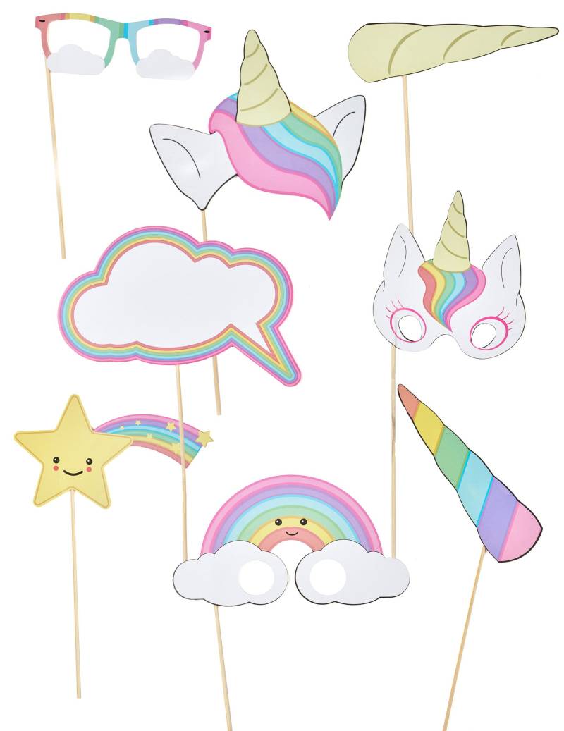 Dieses Einhorn-Baby-Photobooth-Kit besteht aus 8 Zubehörteilen. Die Motive sind an kleine Holzstäbchen zur einfachen Handhabung montiert. Die Einzelteile aus Karton gibt es in Form von einem Einhorn, einer Einhornmaske, einer Wolke, einer Brille, einem Regenbogen und einer Sternschnuppe. Um lustige Fotos zu machen und ein Erinnerungsstück an Ihre Gäste auf einer Hochzeit oder Party zu behalten, ist dieses Einhorn-Baby-Photobooth-Kit ideal!