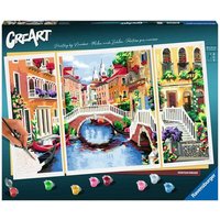 Das schöne CreArt Premium Motiv Venetian Dreams von Ravensburger sorgt für großartigen Malspaß für Erwachsene ab 14 Jahren und pure Entspannung. Die Motivlinien sind bereits aufgedruckt und nummeriert und werden mit den bereits fertig gemischten Acrylfarben ausgemalt. Das ist Malspaß mit Erfolgsgarantie für einen einzigartigen Wandschmuck für das eigene Zuhause oder zum Verschenken. So einfach war malen noch nie! Mit CreArt - Malen nach Zahlen von Ravensburger den Weg zur inneren Ruhe und Entspannung finden und sich beim genauen Ausmalen in entfernte Städte und Landschaften träumen. Einfach auspacken und los malen: jedes Malset enthält alles, was zum Malen benötigt wird und es ist kein Mischen der Farben notwendig. Das Ravensburger CreArt - Malen nach Zahlen Programm bietet eine große Motivauswahl für Kinder und Erwachsene. Inhalt/Ausstattung 1 Maltafel im Format 40 x 50 cm und 2 Maltafeln im Format 20 x 50 cm (Gesamtgröße: 80 x 50 cm), Acrylfarben auf Wasserbasis in wiederverschließbaren Näpfchen, Doppelpinsel, Farbpalette, Vorlageblatt, Glanzlack und Anleitung Ohne Rahmen