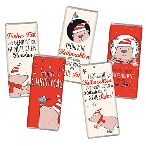 Super süßes Geschenk zu Weihnachten. Fünf leckere 18g Mini-Vollmilchschokoladen mit lieben Grüßen und fröhlichen Motiven. Sie können auch gut einzeln oder als Befüllung für den Adventskalender verwendet werden. Auch als Tischdekoration sind die kleinen Täfelchen ein echter Hingucker und versüßen uns die Adventsstunden. Die weihnachtlichen Schokoladen sind vielseitig einsetzbar und das perfekte Mitbringsel für alle deine Lieben zum Advent oder Wichtel. Eine Kleinigkeit für Freunde, die Familie, Nachbarn und Kollegen. Aber auch jedes Kind wird sich über die süße Nascherei ganz bestimmt freuen. Aber auch für Mitarbeiter und Kunden sind diese kleinen Tafeln eine besondere Aufmerksamkeit. In unserem Shop amazon.de/steinbeck findest du noch viele weitere süße Geschenke zur Advents- und Weihnachtszeit. Mit dabei sind auch komplett fertig verpackte Geschenktüten und Geschenkboxen, die mit gebundener Schleife und Geschenkanhänger noch veredelt werden. Dieses Design Produkt wird im Familienunternehmen Crecom Handels GmbH & Co.KG mit Sitz im hessischen Fulda handveredelt. Die Familie Steinbeck designt und produziert alles im eigenen Haus und hat sich auf die Veredelung von süßen Artikeln spezialisiert, wie Schokolade oder Fruchtgummi. Kleine, feine persönliche Geschenke mit Botschaft zu den verschiedensten Anlässen., Hersteller: Steinbeck