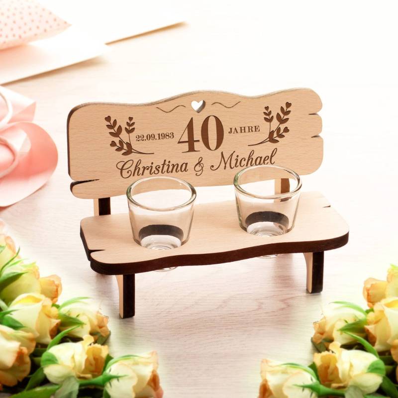 Geschenkidee zum 40-jährigen Ehejubiläum Ein 40-jähriges Ehejubiläum ist ein wahrhaft bemerkenswerter Meilenstein, der gefeiert werden sollte. Nach vier Jahrzehnten der Liebe, Unterstützung und gemeinsamen Erinnerungen verdienen Ehepaare etwas Besonderes, das ihre außergewöhnliche Bindung würdigt. Wenn Du auf der Suche nach einem unvergesslichen Geschenk bist, das diese bedeutende Leistung zelebriert, dann ist eine Schnapsbank mit Gläsern die perfekte Wahl. Die Schnapsbank ist ein einzigartiges und stilvolles Schnapsbrett, das nicht nur funktional ist, sondern auch eine symbolische Bedeutung hat. Die Holzbank verkörpert gemeinsame Zeit, Entspannung und Genuss, was die Grundpfeiler einer soliden Ehe sind. Die Bank besteht aus hochwertigem Holz und wird mit den Namen des Ehepaars und dem Datum der Hochzeit sorgfältig graviert. Die personalisierte Gravur verleiht dem Geschenk eine besondere Bedeutung und macht es zu einem einzigartigen Erinnerungsstück, das das Paar für den Rest ihres