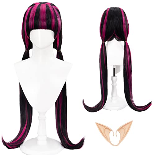 Schwarze Mischung Pink Cosplay-Perücke mit Pony, Elfenohren und kostenlosem Perücken-Netz - 80cm hitzebeständige synthetische Faserperücke für Halloween, Themenpartys und Anime-Fans