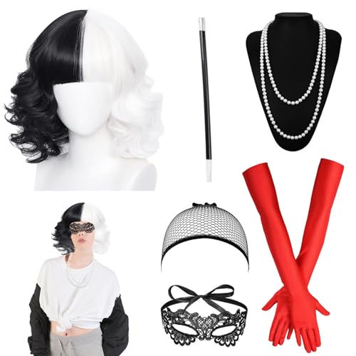 SPERMUOY Cruella Kostüm Damen,Cruella Perücke Halb Schwarz Halb Weiß Perücke Damen Kurz Lockig und Perückenkappe,Perücke schwarz weiß Cruella für Kostümparty Halloween Karneval