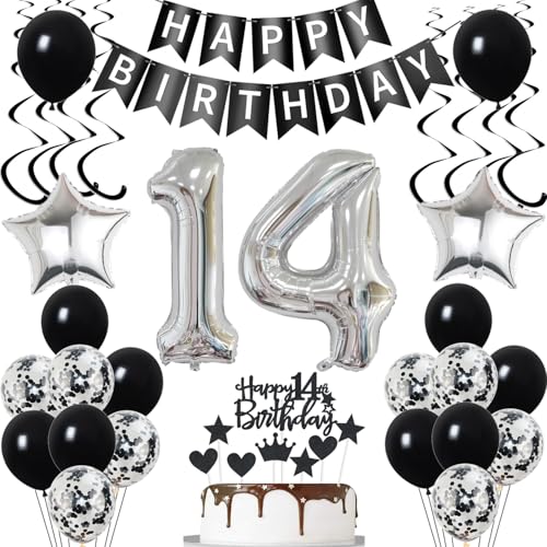 14. Geburtstag Deko Schwarz, luftsballon 14. Geburtstag Mädchen Junge Dekoration,Geburtstagsdeko 14 Jahre Mädchen ballon,Tortendeko 14. Junge Set