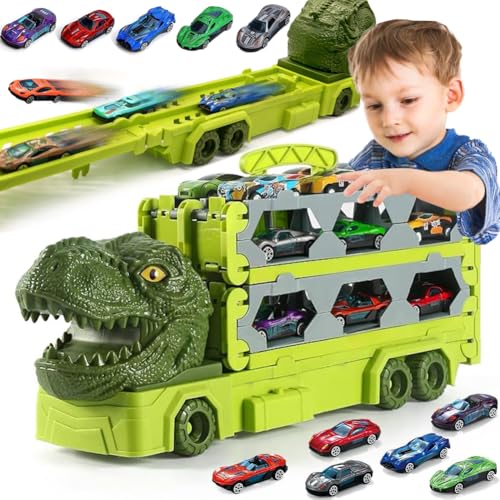TOPLIVING Spielzeug für Jungen im Alter von 2, 3, 4, 5, 6 Jahren: 66 Zoll Rennstrecke mit Druckguss-Dinosaurier-Transporter, Spielzeugauto-Set für Jungen.