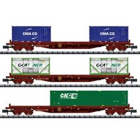 Spur Minitrix - Art.Nr. 15072 Containertragwagen-Set Rs Vorbild: 3 vierachsige Flachwagen mit Rungen der Bauart Rs der SNCF. Beladen mit unterschiedlichen Wechselbehältern: 20-Fuß-Containern, 20-Fuß-Tankcontainern und neukonstruierten 40-Fuß-Containern. Betriebszustand um 2004. Art.Nr. 15072 Spur Minitrix Epoche VI Art Güterwagensets Ab Werk lieferbar Highlights Neuer 40-Fuß-Container. Produktbeschreibung Modell: Drehgestelle Typ Y 25, mit Kinematik für Kurzkupplung, beladen mit unterschiedlichen Containern. Gesamtlänge über Puffer 372 mm.