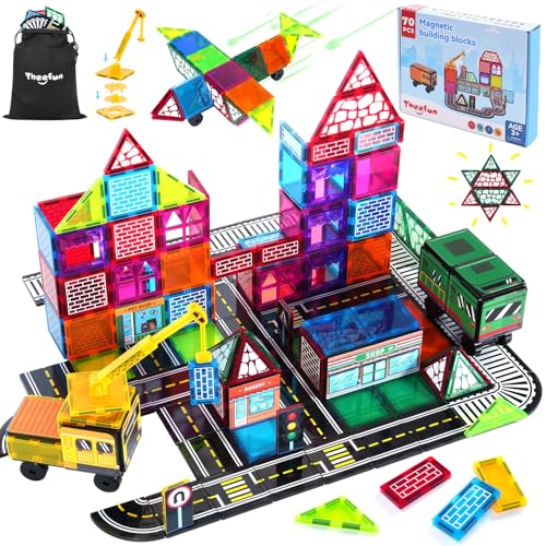 Theefun Magnetische Bausteine, 70PCS 3D Doppelseitiges Straßenset Magnetbausteine mit Kran und Auto STEM Lernen Sensorische Montessori Spielzeug Geschenk für 3+ Jahre alte Jungen und Mädchen
