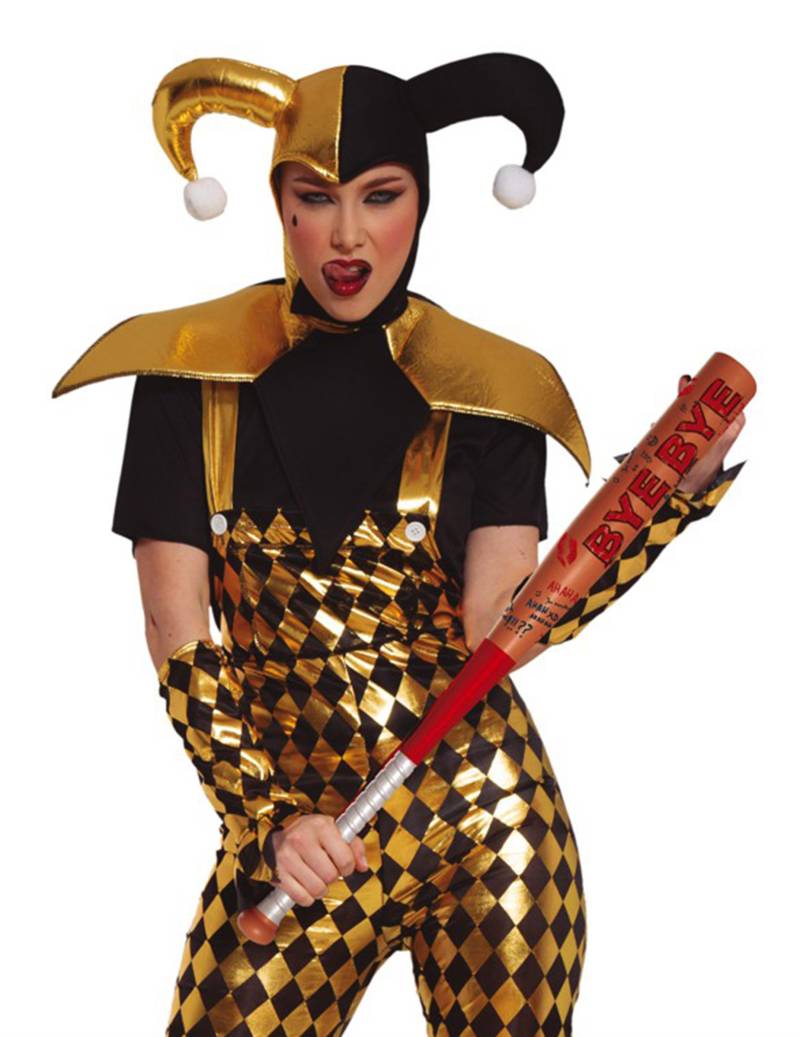 Dieser Baseballschläger einer Superschurkin ist für Erwachsene und misst ungefähr 73 cm. Bedruckt ist der Baseballschläger für Clowns mit einer beigen Farben, die an Holz erinnert und wird ergänzt von einem roten Stiel sowie einem silberfabenem Griff. Coole Beschriftungen für einen bekannten Fledermaus-Helden befinden sich überall auf dem Schläger. So liest man in roten großen Buchstaben "Bye Bye" gefolgt von einem Kussmund. Der Harlekin-Baseballschläger ist ein super colles Kostümaccessoire für alle verrückten Clown-Schurkinnen, die an Karneval oder Halloween Ihr Psychoclown-Damenkostüm vervollständigen möchten und so richtig auf die Pauke hauen wollen.