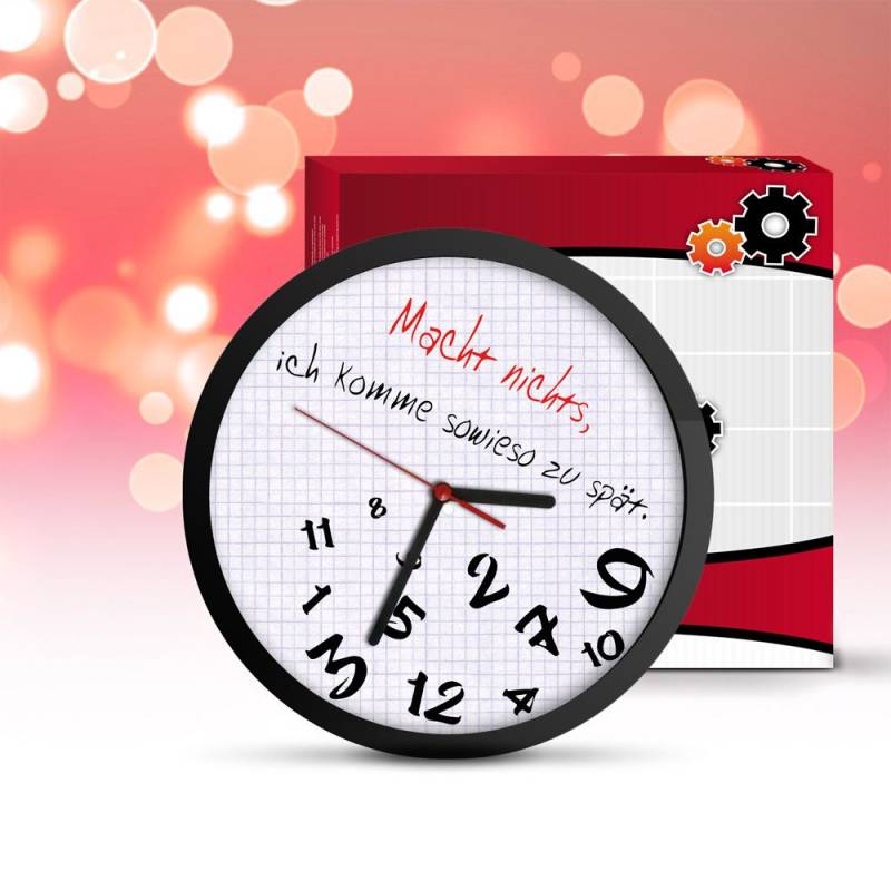 Die Uhr für ZeitverbummlerOrdnung und Pünktlichkeit sind zwei typisch deutsche Tugenden. Trotzdem gibt es immer wieder Menschen, die einfach nicht pünktlich kommen können. In Ländern wie Spanien haben die Menschen zum Beispiel ein ganz anderes Verständnis von Zeit als wir Deutschen. Eine Stunde zu spät zu kommen wird dort als normal empfunden. Mach Dir also das nächste Mal wenn Du zu spät kommst keine Gedanken, sondern nimm es lieber mit Humor. Nichts anderes macht unsere Wanduhr für zu spät Kommer.Sie wirkt auf den ersten Blick vielleicht wie eine normale Uhr. Aber bei genauerem Hinschauen wird Dir auffallen, dass die Ziffern ein wenig durcheinander geraten sind. Um genau zu sein sind sie wild zerstreut. Dazu prangt gut sichtbar die entschuldigende Aussage:Macht nichts, ich komme sowieso zu spät. Mit dieser Aussage richtet sie sich an alle, die öfter einmal zu spät kommen und mit Humor darüber stehen. Die Wanduhr trumpf mit ihrem schlichten Design in den klassischen Farben schwarz