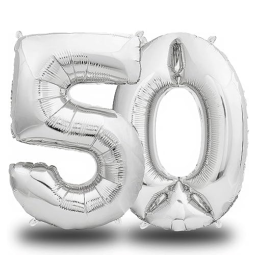 🎈LUFTBALLONS 50er GEBURTSTAG: 2 Ballons in Titan Silber im Set. XXL 40" (101cm). Hochwertig verarbeitet, für schöne Geburtstagsmomente & Motto Partys. Für jedes Geburtstagskind geeignet, egal ob Mann oder Frau 🎈MEHR FÜR'S GELD: 2x aufblasbare 50er Luftballons als Dekoartikel und Partyzubehör. Die glitzernde Hängedeko kommt auch als Geschenk gut an. Geburtstags Deko. Leicht kombinierbar mit anderen Farben wie weiß oder schwarz 🎈HELIUM ODER LUFT: Die Zahlenluftballons können mit Helium oder Luft befüllt werden. Das Aufblasen kann über eine einfache Aufblasröhrchen (im Zubehör enthalten) erfolgen und dauert nur wenige Minuten. Das Ventil schließt sich selbstständig und hält Helium für bis zu 8 Tage 🎈EINFACHE BEFESTIGUNG: Die Luftballons sind mit jeweils vier Laschen zur Befestigung ausgestattet. Heliumgefüllte Ballons werden so an Ort und Stelle gehalten. Luftbefüllte Ballons können Sie einfach von der Decke hängen lassen. 🎈FLIEGT MIT HELIUM: Werden die großen Zahlen mit Helium gefüllt, schweben sie für bis zu 8 Tage. Sorgt garantiert für eine große Überraschung und gibt der Party das gewisse Extra., Hersteller: Vertfort Ltd