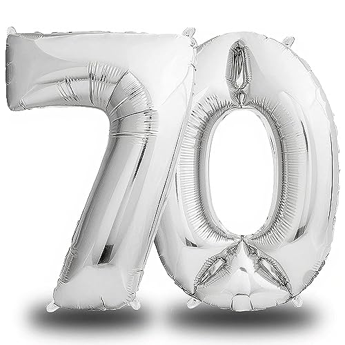 🎈LUFTBALLONS 70er GEBURTSTAG: 2 Ballons in Titan Silber im Set. XXL 40" (101cm). Hochwertig verarbeitet, für schöne Geburtstagsmomente & Motto Partys. Für jedes Geburtstagskind geeignet, egal ob Mann oder Frau 🎈MEHR FÜR'S GELD: 2x aufblasbare 70er Luftballons als Dekoartikel und Partyzubehör. Die glitzernde Hängedeko kommt auch als Geschenk gut an. Geburtstags Deko. Leicht kombinierbar mit anderen Farben wie weiß oder schwarz 🎈HELIUM ODER LUFT: Die Zahlenluftballons können mit Helium oder Luft befüllt werden. Das Aufblasen kann über eine einfache Aufblasröhrchen (im Zubehör enthalten) erfolgen und dauert nur wenige Minuten. Das Ventil schließt sich selbstständig und hält Helium für bis zu 8 Tage 🎈EINFACHE BEFESTIGUNG: Die Luftballons sind mit jeweils vier Laschen zur Befestigung ausgestattet. Heliumgefüllte Ballons werden so an Ort und Stelle gehalten. Luftbefüllte Ballons können Sie einfach von der Decke hängen lassen. 🎈FLIEGT MIT HELIUM: Werden die großen Zahlen mit Helium gefüllt, schweben sie für bis zu 8 Tage. Sorgt garantiert für eine große Überraschung und gibt der Party das gewisse Extra., Hersteller: Vertfort Ltd