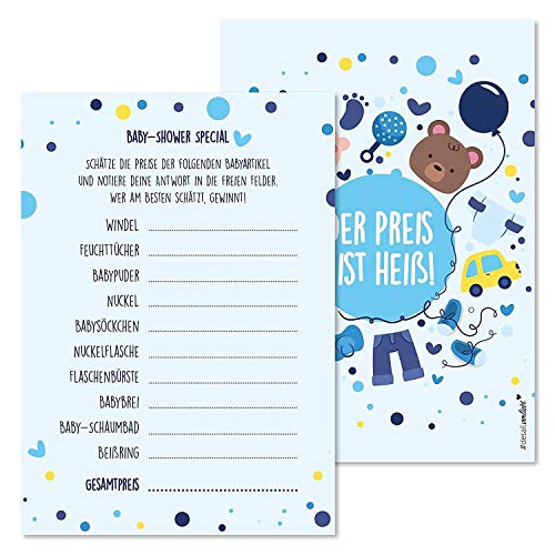 #detailverliebt 15 Spiel-Karten zur Baby-Party I dv161 I DIN A6 I Set Baby-Party blau Junge Boy Invitations Spiele Quiz Preise schätzen
