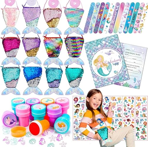 zycBernoi Meerjungfrau Kindergeburtstag Party Mitgebsel Set,12 Einladungskarten, Meerjungfrau Pailletten Geldbörse, Slap Armbänder, Tattoos und Briefmarke usw Perfekt für Kinder Party Kinder